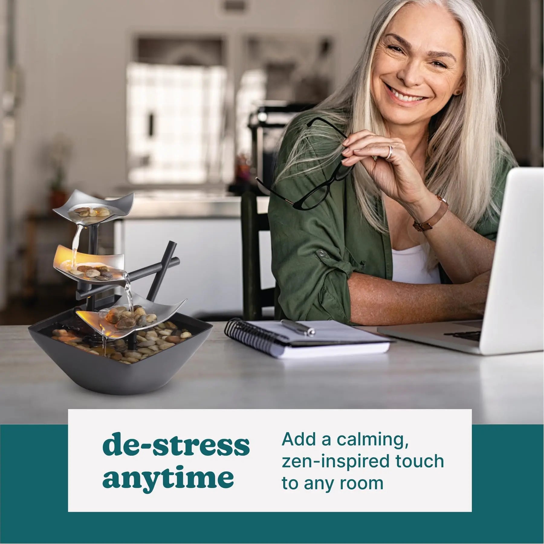 The soft trickle of water creates a soothing background that helps clear your mind, enhance concentration, and encourage deeper, more restful sleep. Perfect for your workspace by day — and your bedroom by night.